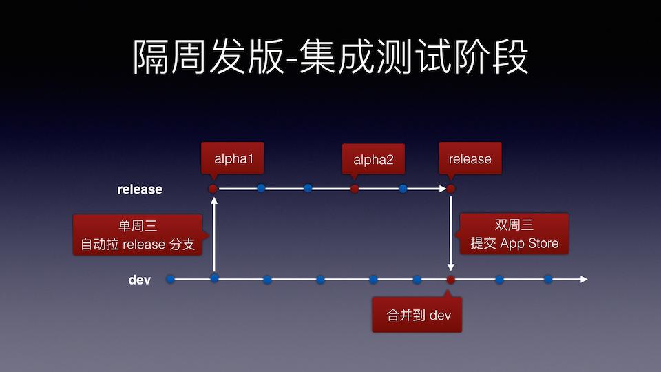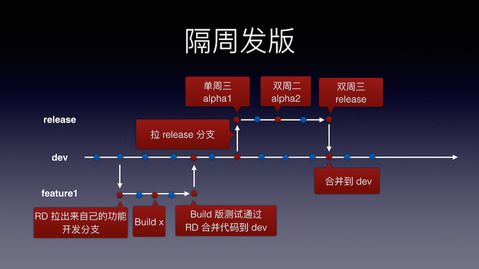 - 2:单周三下午,从dev拉出这次要发版的release分支,在release分支打包,交付给测试,进入alpha1阶段。(alpha1阶段主要是做bugfix,测试不停的报bug,然后RD不停的fix),这个alpha阶段都围绕release分支进行