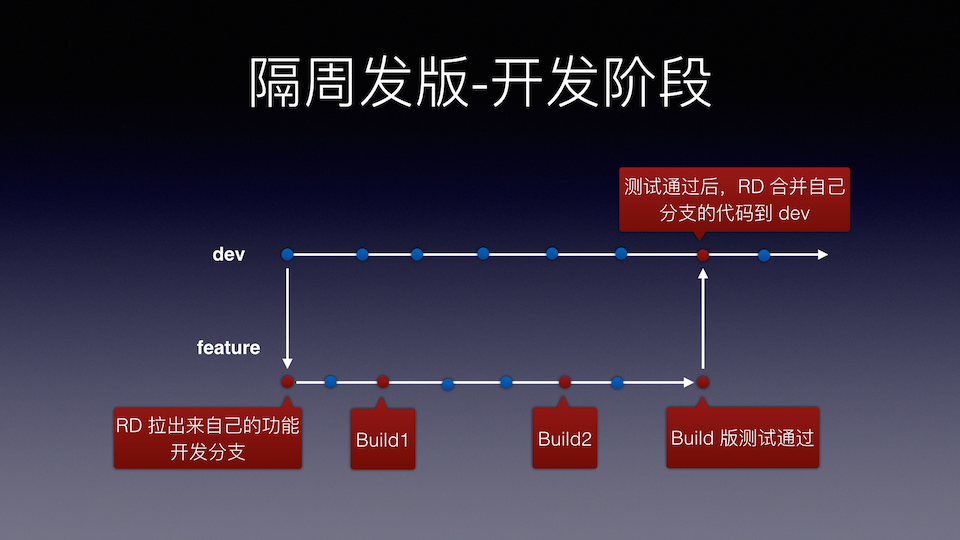 - 1:RD从dev拉出分支如图feature1,进行开发,开发完毕,将feature1分支的build包交付给测试团队进行测试,直到bugfix完毕,测试通过,最终确保将feature1代码在单周三之前merge到dev。